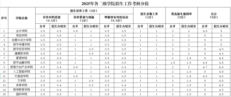 为全面提升学校招生工作质量,优化生源结构,保障招生计划有效落实,根据《广州华商学院 2025 年二级单位绩效考核激励方案(试行)》(华商院〔2025〕244 号)和广州华商学院关于印发《广州华商学院2025年二级学院招生工作考核办法》(华商院〔2025〕311号)文件精神 ,对各二级学院在招生宣传、招生录取及新生报到率等方面的年度工作进行量化评估。考核总分为 5 分。经各二级学院自评,招生办核实。现予以公示,公示时间从2026年1月22日至2026年1月24日止。